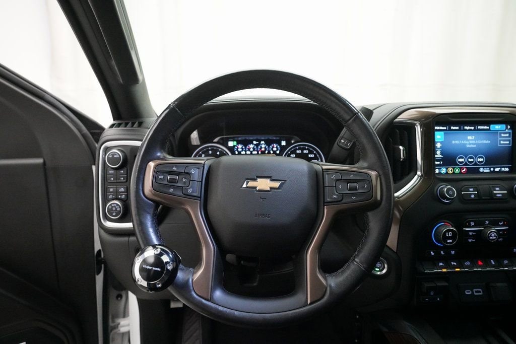 Chevrolet Certified Pre-Owned Certified, 10-Way Power Driver Seat w/Lumbar, 10-Way Power Passenger Seat Adjuster w/Lumbar, 12-Volt Rear Auxiliary Power Outlet, 120-Volt Bed Mounted Power Outlet, 120-Volt Instrument Panel Power Outlet, 170 Amp Alternator, 2nd Row Heated Outboard Seats, 3.23 Rear Axle Ratio, 4-Wheel Disc Brakes, 7 Speakers, 8 Driver Information Center, ABS Brakes, Adaptive Cruise Control, Adaptive Ride Control Suspension, Advanced Trailering System, Air Conditioning, All-Weather Floor Liner (LPO), Alloy wheels, AM/FM radio: SiriusXM with 360L, Apple CarPlay/Android Auto, Auto-dimming door mirrors, Auto-Dimming Inside Rear-View Mirror, Auto-dimming Rear-View mirror, Auto-Locking Rear Differential, Automatic Emergency Braking, Automatic temperature control, Auxiliary External Transmission Oil Cooler, Bluetooth® For Phone, Body-Color Painted Mirror Caps, Brake assist, Bumpers: body-color, Chevrolet Connected Access Capable, Chevytec Spray-On Black Bedliner, Chrome Assist Steps, Chrome Grille, Chrome Recovery Hooks, Color-Keyed Carpeting Floor Covering, Compass, Deep-Tinted Glass, Delay-off headlights, Driver door bin, Driver Memory, Driver vanity mirror, Dual Exhaust w/Polished Outlets, Dual front impact airbags, Dual front side impact airbags, Dual-Climate Control, Electric Rear-Window Defogger, Electronic Cruise Control, Electronic Stability Control, Floor Mounted Center Console, Following Distance Indicator, Forward Collision Alert, Front anti-roll bar, Front Black Bowtie Emblem (LPO), Front Bucket Seats, Front Carpeted Floor Mats, Front Center Armrest, Front fog lights, Front LED Fog Lamps, Front Pedestrian Braking, Front reading lights, Front wheel independent suspension, Fully Automatic Headlights, Garage door transmitter, HD Rear Vision Camera, Heated Driver & Front Outboard Passenger Seats, Heated Front Seats, Heated Sideview Mirrors, Heated Steering Wheel, Heated Steering Wheel, Heavy Duty Suspension, High Country Deluxe, Hitch Guidance, Hitch Guidance w/Hitch View, Illuminated entry, Integrated Trailer Brake Controller, IntelliBeam Automatic High Beam On/Off, Keyless Open & Start, Lane Change Alert w/Side Blind Zone Alert, Lane Keep Assist w/Lane Departure Warning, Leather Wrapped Steering Wheel, LED Cargo Area Lighting, Low Tire Pressure Warning, Manual Tilt/Telescoping Steering Column, Memory seat, Navigation System, Not Equipped w/Automatic Stop/Start, Not Equipped w/Front & Rear Park Assist, Occupant sensing airbag, OnStar & Chevrolet Connected Services Capable, Outside Heated Power-Adjustable Mirrors, Outside Temperature Display, Overhead airbag, Overhead console, Panic alarm, Passenger door bin, Passenger vanity mirror, Perforated Leather Seat Trim, Power Adjusting Driver Seat, Power Door Locks, Power Front Passenger Windows w/Express Up/Down, Power Front Windows w/Driver Express Up/Down, Power passenger seat, Power Rear Windows w/Express Down, Power Sideview Mirrors, Power Sliding Rear Window w/Rear Defogger, Power steering, Power Sunroof, Power Tailgate, Power Windows, Power-Retractable Assist Steps, Preferred Equipment Group 3LZ, Premium audio system: Chevrolet Infotainment 3 Premium, Premium Bose 7-Speaker Sound System, Radio data system, Radio: Chevrolet Infotainment 3 Premium System, Rear Carpeted Floor Mats, Rear Cross Traffic Alert, Rear Dual USB Charging-Only Ports, Rear reading lights, Rear seat center armrest, Rear Step Bumper, Rear Wheelhouse Liners, Rear/Front Window Defroster, Remote Keyless Entry, Remote Vehicle Starter System, Safety Alert Seat, Safety Package II, Security system, SiriusXM w/360L, Speed control, Speed-sensing steering, Split Folding Rear Seat, Standard Tailgate, Steering Wheel Audio Controls, Steerin