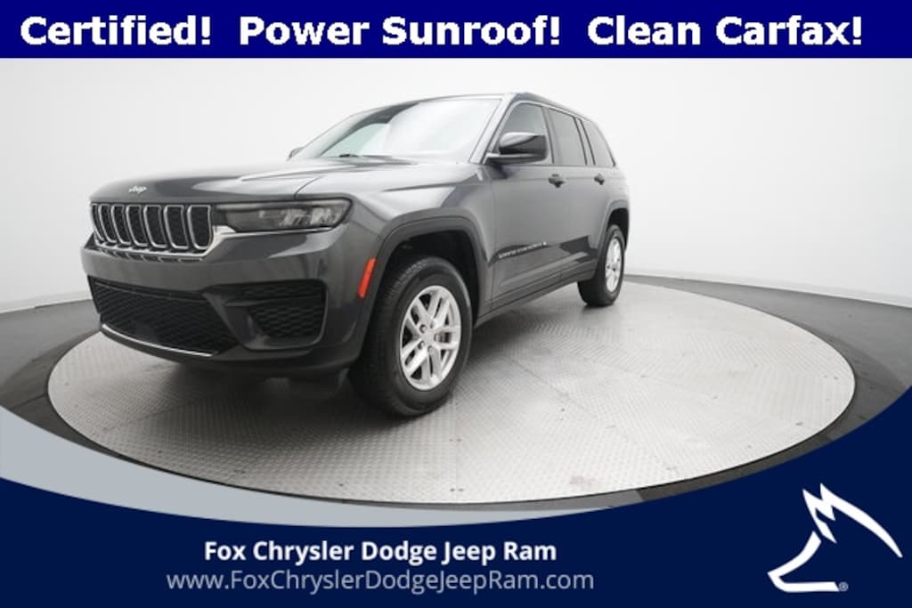 Certified. Baltic Gray Metallic Clearcoat 2023 Jeep Grand Cherokee Laredo 4WD 4WD, Active Cruise Control, Air Conditioning, Automatic temperature control, Dual-Climate Control, Four wheel independent suspension, Fully automatic headlights, Heated Rearview Mirrors, Laredo X, ParkView Rear Back-Up Camera, Power Adjusting Driver Seat, Power steering, Power Sunroof, Power windows, Quick Order Package 23D Laredo X, Radio: Uconnect 5 w/8.4" Display, Remote Keyless Entry, Speed control, Wheels: 18" x 8" Fully Painted Aluminum.