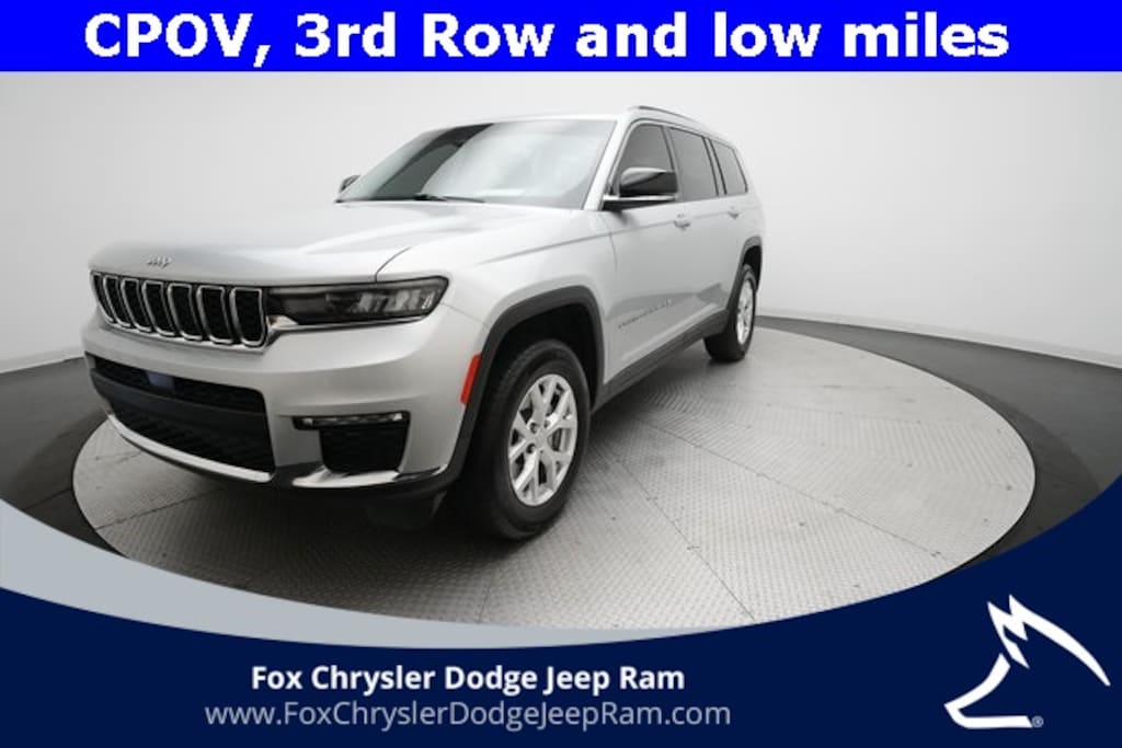 Clean CARFAX. Certified. Silver Zynith 2023 Jeep Grand Cherokee L Limited 4WD Grand Cherokee L Limited, 3rd Row Seats, Active Cruise Control, Air Conditioning, Alpine Sound, Auto High-beam Headlights, Automatic temperature control, Capri Leatherette Seats, Dual-Climate Control, Four wheel independent suspension, Front fog lights, Fully automatic headlights, Garage door transmitter, Heated Front Seats, Heated Rear Seats, Heated Rearview Mirrors, Heated Steering Wheel, Memory seat, Navigation System, ParkView Rear Back-Up Camera, Power Liftgate, Quick Order Package 23E, Radio: Uconnect 5 Nav w/10.1" Display, Rear air conditioning, Reclining 3rd row seat, Wheels: 18" x 8.0" Fully Painted Aluminum.