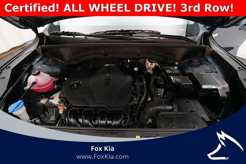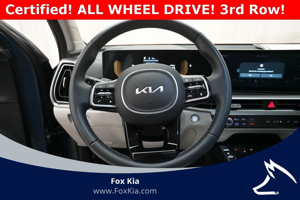 Kia Certified Pre-Owned Certified, AWD, 3rd Row Seats, 4-Wheel Disc Brakes, 4.081 Axle Ratio, 6 Speakers, ABS Brakes, Air Conditioning, Alloy wheels, AM/FM Radio, Available Sirius XM Radio, Apple CarPlay & Android Auto, Auto High-beam Headlights, Automatic temperature control, Brake Assist, Bumpers: body-color, Carpeted Floor Mats, Delay-off headlights, Driver door bin, Driver vanity mirror, Dual front impact airbags, Dual front side impact airbags, Dual-Climate Control, Electronic Stability Control, Emergency communication system: 911 Connect, Four wheel independent suspension, Front anti-roll bar, Front Bucket Seats, Front Center Armrest, Front Fog Lights, Front reading lights, Fully Automatic Headlights, Heated Front Bucket Seats, Heated Front Seats, Heated Sideview Mirrors, Illuminated Entry, Knee airbag, Leather Shift Knob, Leather steering wheel, LED Interior Lighting, Low Tire Pressure Warning, Navigation System, Occupant sensing airbag, Outside Temperature Display, Overhead airbag, Overhead console, Panic Alarm, Panoramic Power Sunroof w/Power Sunshade, Panoramic Sunroof Package, Passenger door bin, Passenger vanity mirror, Power Adjusting Driver Seat, Power door mirrors, Power steering, Power Windows, Radio data system, Radio: AM/FM Audio System, Rear anti-roll bar, Rear reading lights, Rear seat center armrest, Rear side impact airbag, Rear Spoiler, Rear Window Wiper, Rear-View Camera, Rear/Front Window Defroster, Remote Keyless Entry, Security System, Smart Key w/ Push Button and Remote Start, Speed control, Speed-sensing steering, Split Folding Rear Seat, Steering Wheel Mounted Controls, SynTex Artificial Leather Seat Trim, Tachometer, Telescoping steering wheel, Tilt steering wheel, Traction Control, Trip computer, Turn Signal Indicator Mirrors, Variably intermittent wipers, Wheels: 7.5J x 18" Alloy w/Machine Finish, AWD.