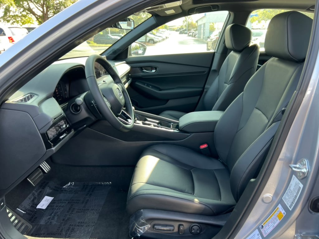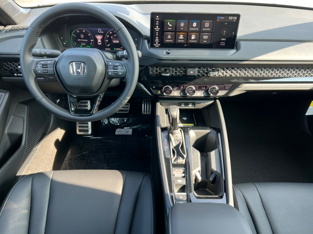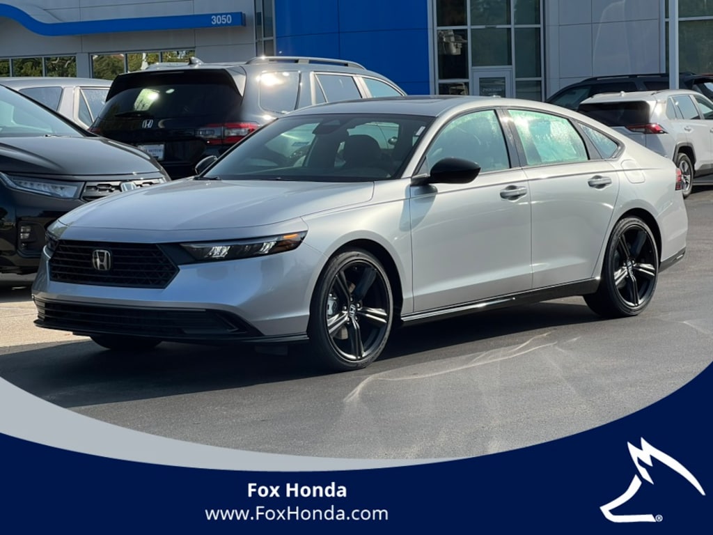 Solar Silver Metallic 2025 Honda Accord Hybrid Sport-L FWD eCVT 2.0L I4 DOHC 16V 4-Wheel Disc Brakes, 8 Speakers, ABS Brakes, Adaptive Cruise Control: Adaptive Cruise Control (ACC) with Low-Speed Follow, Air Conditioning, Alloy wheels, AM/FM Radio, Apple CarPlay/Android Auto, Auto High-beam Headlights, Automatic temperature control, Blind Spot Information (BSI) System warning, Brake Assist, Bumpers: body-color, Compass, Delay-off headlights, Driver door bin, Driver vanity mirror, Dual front impact airbags, Dual front side impact airbags, Dual-Climate Control, Electronic Stability Control, Emergency communication system: HondaLink, Four wheel independent suspension, Front anti-roll bar, Front Bucket Seats, Front Center Armrest, Front reading lights, Fully Automatic Headlights, Heated Front Bucket Seats, Heated Front Seats, Illuminated Entry, Knee airbag, Lane departure: Lane Keeping Assist System (LKAS) active, Leather Shift Knob, Leather steering wheel, Leather-Trimmed Seat Trim, Low tire pressure warning, Memory seat, Occupant sensing airbag, Outside Temperature Display, Overhead airbag, Overhead Console, Panic Alarm, Passenger door bin, Passenger vanity mirror, Power Adjusting Driver Seat, Power Moonroof, Power passenger seat, Power Sideview Mirrors, Power Steering, Power Windows, Radio data system, Radio: 180-Watt Audio System, Rear anti-roll bar, Rear reading lights, Rear seat center armrest, Rear side impact airbag, Rear Spoiler, Rear-View Camera, Rear/Front Window Defroster, Remote Keyless Entry, Security System, Speed Control, Speed-Sensing Steering, Speed-Sensitive Wipers, Split Folding Rear Seat, Steering Wheel Mounted Controls, Telescoping steering wheel, Tilt steering wheel, Traction Control, Trip computer, Variably intermittent wipers, Wheels: 19" x 8.5J Matte Berlina Black.