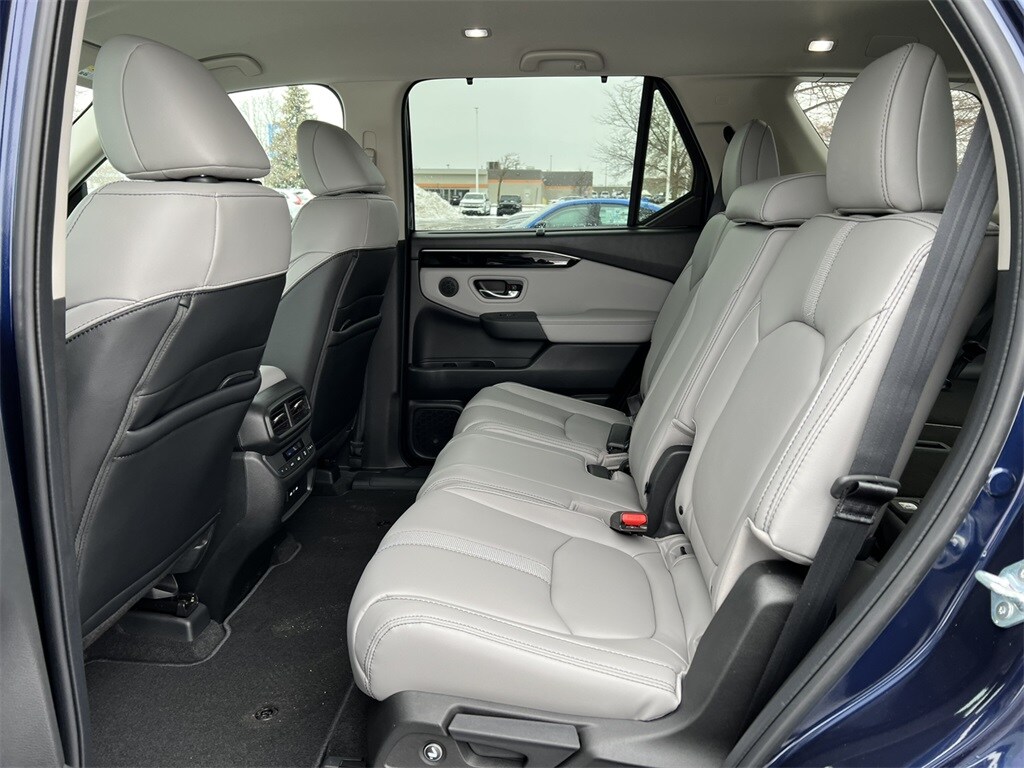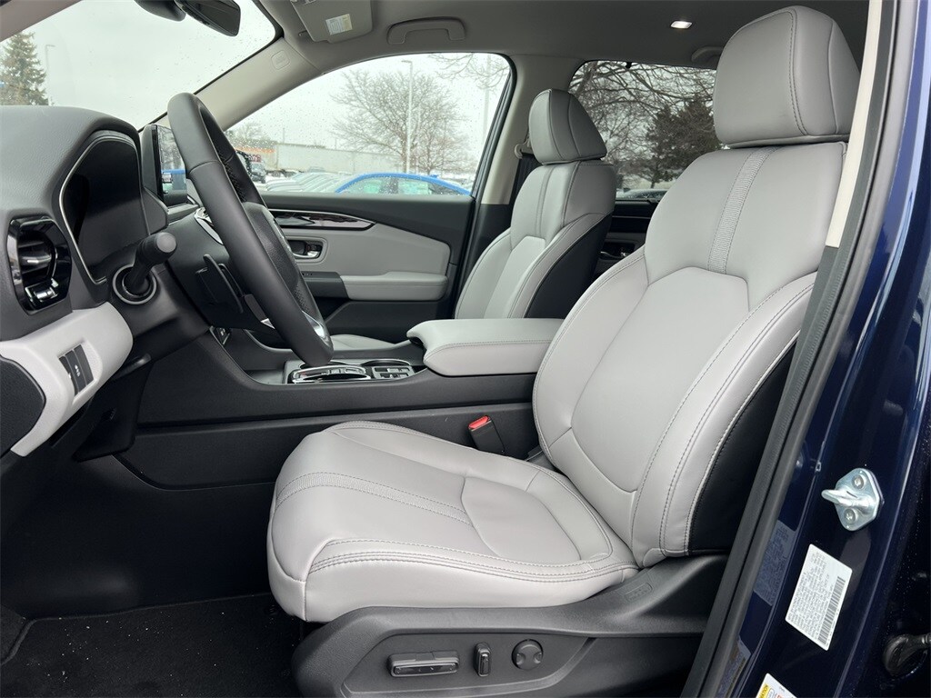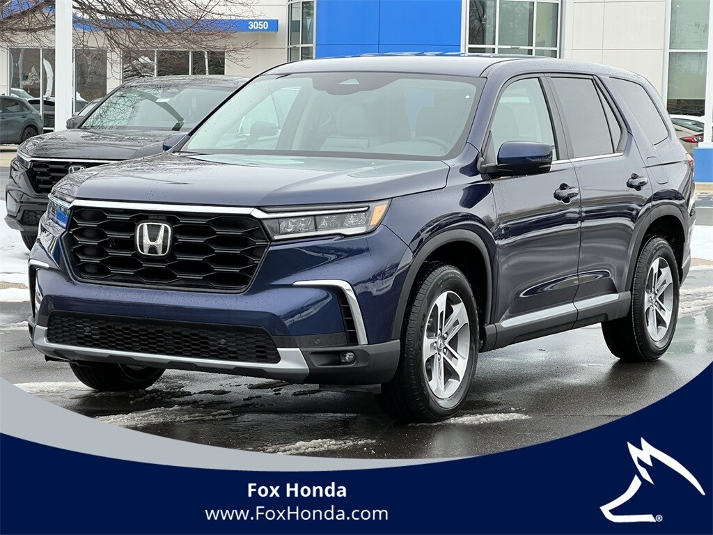 Obsidian Blue Pearl 2025 Honda Pilot EX-L AWD 10-Speed Automatic 3.5L V6 DOHC 24V 3rd Row Seats, 4-Wheel Disc Brakes, 4.167 Axle Ratio, 9 Speakers, ABS Brakes, Adaptive Cruise Control: Adaptive Cruise Control (ACC) with Low-Speed Follow, Air Conditioning, Alloy wheels, AM/FM Radio, Available Sirius XM Radio, Apple CarPlay/Android Auto, Auto High-beam Headlights, Auto-dimming Rear-View mirror, Automatic temperature control, Blind Spot Information (BSI) System warning, Brake Assist, Bumpers: body-color, Delay-off headlights, Driver door bin, Driver vanity mirror, Dual front impact airbags, Dual front side impact airbags, Dual-Climate Control, Electronic Stability Control, Emergency communication system: HondaLink Assist, Four wheel independent suspension, Front anti-roll bar, Front Bucket Seats, Front Center Armrest, Front Fog Lights, Front reading lights, Fully Automatic Headlights, Garage door transmitter: HomeLink, Heated Front Bucket Seats, Heated Front Seats, Heated Sideview Mirrors, Illuminated Entry, Knee airbag, Lane departure: Lane Keeping Assist System (LKAS) active, Leather Seat Trim, Low tire pressure warning, Memory seat, Occupant sensing airbag, Outside Temperature Display, Overhead airbag, Overhead Console, Panic Alarm, Passenger door bin, Passenger vanity mirror, Power Adjusting Driver Seat, Power Liftgate, Power passenger seat, Power Sideview Mirrors, Power Steering, Power Windows, Radio data system, Radio: 245-Watt Audio System, Rear air conditioning, Rear anti-roll bar, Rear reading lights, Rear seat center armrest, Rear Spoiler, Rear Window Wiper, Rear-View Camera, Rear/Front Window Defroster, Reclining 3rd row seat, Remote Keyless Entry, Security System, SiriusXM, Speed Control, Speed-Sensing Steering, Speed-Sensitive Wipers, Split Folding Rear Seat, Steering Wheel Mounted Controls, Tachometer, Telescoping steering wheel, Tilt steering wheel, Traction Control, Trip computer, Turn signal indicator mirrors, Variably intermittent wipers, Wheels: 18" Pewter Gray Machined Face.