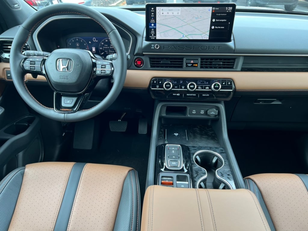 Crystal Black Pearl 2026 Honda Passport TrailSport Elite AWD 10-Speed Automatic 3.5L V6 DOHC 24V 12 Speakers, 4-Wheel Disc Brakes, ABS Brakes, Adaptive Cruise Control: Adaptive Cruise Control (ACC) with Low-Speed Follow, Air Conditioning, Alloy wheels, Apple CarPlay/Android Auto, Auto High-beam Headlights, Auto-dimming door mirrors, Auto-dimming Rear-View mirror, Automatic temperature control, Blind Spot Information (BSI) System warning, Brake Assist, Compass, Delay-off headlights, Driver door bin, Driver vanity mirror, Driver's Seat Mounted Armrest, Dual front impact airbags, Dual front side impact airbags, Dual-Climate Control, Electronic Stability Control, Emergency communication system: HondaLink, Four wheel independent suspension, Front anti-roll bar, Front Bucket Seats, Front Center Armrest, Front Fog Lights, Front reading lights, Fully Automatic Headlights, Heated & Cooled Front Bucket Seats, Heated Front Seats, Heated Rear Seats, Heated Sideview Mirrors, Heated Steering Wheel, HVAC memory, Illuminated Entry, Knee airbag, Lane departure: Lane Keeping Assist System (LKAS) active, Leather steering wheel, Low tire pressure warning, Memory seat, Navigation system: Google Maps, Occupant sensing airbag, Outside Temperature Display, Overhead airbag, Overhead Console, Panic Alarm, Passenger door bin, Passenger seat mounted armrest, Passenger vanity mirror, Perforated Leather Seat Trim, Power Adjusting Driver Seat, Power Liftgate, Power Moonroof, Power passenger seat, Power Sideview Mirrors, Power Steering, Power Windows, Radio data system, Radio: Bose Premium Sound System w/12 Speakers, Rain Sensing Wipers, Rear air conditioning, Rear anti-roll bar, Rear reading lights, Rear seat center armrest, Rear Spoiler, Rear Window Wiper, Rear-View Camera, Rear/Front Window Defroster, Remote Keyless Entry, Security System, Speed Control, Speed-Sensing Steering, Split Folding Rear Seat, Steering Wheel Mounted Controls, Tachometer, Telescoping steering wheel, Tilt steering wheel, Traction Control, Trip computer, Turn signal indicator mirrors, Variably intermittent wipers, Ventilated front seats, Wheels: 18" Berlina Black Machine Face Alloy.