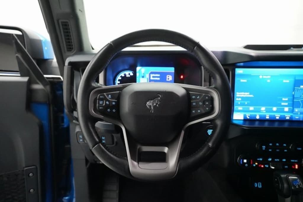 CARFAX One-Owner. Certified. Velocity Blue Metallic 2021 Ford Bronco Outer Banks 4WD 12" LCD Capacitive Touchscreen w/Swipe Capability, 18" Bright Machined Aluminum Wheels, 2 Smart Charging USB Ports In Dashboard, 3.73 Axle Ratio, 360-Degree Camera, ABS brakes, Adaptive Cruise Control, Additional Sound Deadening, Air Conditioning, Auto High-beam Headlights, Compass, Connected Built-In Navigation, Equipment Group 314A Lux Package, Evasive Steering Assist, Forward Sensing System, Front Bucket Seats, Fully automatic headlights, Heated Rearview Mirrors, Heated Steering Wheel, Illuminated entry, Information on Demand Panel, Low tire pressure warning, Radio: B&O Sound System by Bang & Olufsen, Rear-View Camera, Remote Keyless Entry, Sideview Mirrors, Speed control, Steering Wheel Mounted Audio Controls, Traction Control, Universal Garage Door Opener, Wireless Charging Pad.