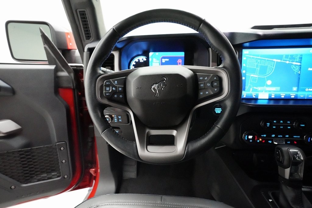 10 Speakers w/Subwoofer, 12" LCD Capacitive Touchscreen w/Swipe Capability, 18" Bright Machined Aluminum Wheels, 2 Smart Charging USB Ports In Dashboard, 360-Degree Camera, 4-Wheel Disc Brakes, 7 Speakers, ABS Brakes, Adaptive Cruise Control, Additional Sound Deadening, Air Conditioning, Alloy wheels, AM/FM radio: SiriusXM with 360L, AM/FM Stereo, Auto High-beam Headlights, Auto-dimming Rear-View mirror, Automatic temperature control, Brake Assist, Carbonized Gray Molded-In-Color Hard Top, Compass, Connected Built-In Navigation, Connected Navigation, Delay-off headlights, Driver door bin, Driver vanity mirror, Dual front impact airbags, Dual front side impact airbags, Dual-Climate Control, Electronic Stability Control, Emergency communication system: 911 Assist, Equipment Group 314A Lux Package, Evasive Steering Assist, Front & Rear Floor Liners w/o Carpet Floor Mats, Front anti-roll bar, Front Bucket Seats, Front Center Armrest, Front Fog Lights, Front Parking Sensors, Front reading lights, Front Row Top Panels Storage Bag, Front wheel independent suspension, Fully Automatic Headlights, Hard Top Sound Deadening Headliner, Heated Front Seats, Heated Leather-Trimmed/Vinyl Bucket Seats, Heated Sideview Mirrors, Heated Steering Wheel, High Clearance Fender Flares, High Clearance Suspension, Illuminated Entry, Information on Demand Panel, Integrated roll-over protection, Keyless Entry Keypad, Leather Shift Knob, Low Tire Pressure Warning, Navigation system: Connected Navigation, Occupant sensing airbag, Outside Temperature Display, Overhead airbag, Overhead console, Panic Alarm, Passenger door bin, Passenger vanity mirror, Position-Sensitive Bilstein Shock Absorbers, Power door mirrors, Power steering, Power Windows, Radio data system, Radio: B&O Sound System by Bang & Olufsen, Rear-View Camera, Rear-Window Defroster & Washer, Remote Keyless Entry, Sasquatch Package, Security System, Sideview Mirrors, SiriusXM Radio w/360L, Speed control, Split Folding Rear Seat, Steering Wheel Mounted Controls, SYNC 4, Tachometer, Telescoping steering wheel, Tilt steering wheel, Towing Capability, Traction Control, Trip computer, Universal Garage Door Opener, Variably intermittent wipers, Voltmeter, Wheels: 17" Black High Gloss-Painted Aluminum, Wireless Charging Pad.