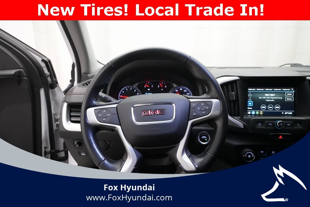 2 USB Data Ports w/Auxiliary Input Jack, 3.47 Axle Ratio, 4-Way Manual Driver's Seat, 4-Way Manual Front Passenger Seat, 4-Wheel Disc Brakes, 6 Speakers, 6-Speaker Audio System Feature, ABS Brakes, Air Conditioning, Alloy wheels, AM/FM Radio, Apple CarPlay/Android Auto, Auto-dimming Rear-View mirror, Bluetooth® For Phone, Brake Assist, Bumpers: body-color, Compass, Delay-off headlights, Driver door bin, Driver vanity mirror, Dual front impact airbags, Dual front side impact airbags, Electronic Stability Control, Emergency Communication System, Four wheel independent suspension, Front anti-roll bar, Front Bucket Seats, Front Center Armrest, Front reading lights, Fully Automatic Headlights, Heated Sideview Mirrors, High-Intensity Discharge Headlights, Illuminated Entry, Low Tire Pressure Warning, Occupant sensing airbag, Outside Temperature Display, Overhead airbag, Overhead console, Panic Alarm, Passenger door bin, Passenger vanity mirror, Power door mirrors, Power steering, Power Windows, Preferred Equipment Group 3SA, Premium Cloth Seat Trim, Radio data system, Radio: GMC Infotainment Audio System w/7" Display, Rear anti-roll bar, Rear seat center armrest, Rear Spoiler, Rear Window Wiper, Rear-View Camera, Rear/Front Window Defroster, Remote Keyless Entry, Security System, Speed control, Speed-sensing steering, Split Folding Rear Seat, Steering Wheel Mounted Controls, Tachometer, Telescoping steering wheel, Tilt steering wheel, Traction Control, Trip computer, Variably intermittent wipers, Wheels: 17" x 7" Silver Painted Aluminum.