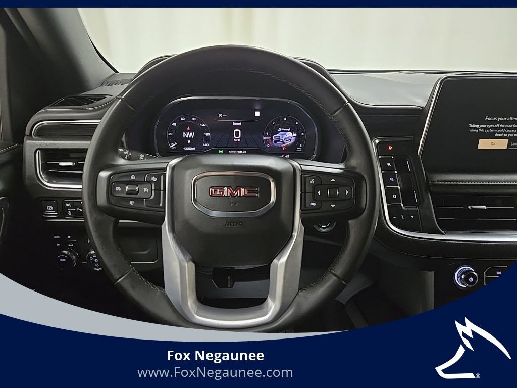 4WD, 2 Presets For Power Driver Seat, 2nd Row Manual-Folding Bucket Seats, 3.23 Rear Axle Ratio, 3rd row seats: split-bench, 4-Wheel Disc Brakes, 9 Speakers, ABS brakes, Air Conditioning, Alloy wheels, AM/FM radio: SiriusXM with 360L, AM/FM Stereo, Apple CarPlay/Android Auto, Auto High-beam Headlights, Auto-dimming Rear-View mirror, Automatic Emergency Braking, Automatic temperature control, Bodyside moldings, Bose 9-Speaker Stereo Audio System Feature, Brake assist, Bright Chrome Bodyside Moldings, Bright Front & Rear Door Sill Plates, Bumpers: body-color, Chrome Door Handles w/Body-Color Strip, Compass, Delay-off headlights, Driver door bin, Driver vanity mirror, Dual front impact airbags, Dual front side impact airbags, Electronic Stability Control, Emergency communication system: OnStar and GMC connected services capable, Following Distance Indicator, Forward Collision Alert, Four wheel independent suspension, Front & Rear Park Assist, Front anti-roll bar, Front Bucket Seats, Front Center Armrest, Front dual zone A/C, Front fog lights, Front Pedestrian Braking, Front reading lights, Fully automatic headlights, Garage door transmitter, Hands-Free Power Programmable Rear Liftgate, Heated & Ventilated Driver & Front Passenger Seats, Heated door mirrors, Heated Driver & Front Passenger Seats, Heated front seats, Illuminated entry, Inside Rear-View Auto-Dimming Mirror, IntelliBeam Automatic High Beam On/Off, Lane Change Alert w/Side Blind Zone Alert, Lane Keep Assist w/Lane Departure Warning, Low tire pressure warning, Memory seat, Navigation System, Occupant sensing airbag, Outside temperature display, Overhead airbag, Overhead console, Panic alarm, Passenger door bin, Passenger vanity mirror, Perforated Leather-Appointed Seating, Power door mirrors, Power driver seat, Power Liftgate, Power passenger seat, Power steering, Power windows, Preferred Equipment Group 4SA, Premium Smooth Ride Suspension, Rain sensing wipers, Rear air conditioning, Rear anti-roll bar, Rear Cross Traffic Alert, Rear reading lights, Rear seat center armrest, Rear window defroster, Rear window wiper, Remote keyless entry, Roof rack: rails only, Safety Alert Seat, Security system, SiriusXM w/360L, Speed control, Speed-sensing steering, Split folding rear seat, Spoiler, Steering wheel mounted audio controls, Tachometer, Telescoping steering wheel, Tilt steering wheel, Traction control, Trip computer, Universal Home Remote, Variably intermittent wipers, Ventilated front seats, Voltmeter, Wheels: 20" x 9" 6-Spoke Polished Aluminum, Wireless Charging, 4WD. EcoTec3 5.3L V8