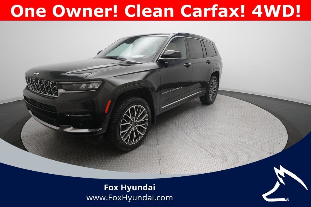 10 Speakers, 19 Speakers High Performance Audio, 2nd Row Manual Window Shades, 3.45 Rear Axle Ratio, 3rd Row Seats, 4-Wheel Disc Brakes, 950 Watt Amplifier, ABS Brakes, Active Noise Control System, Adaptive suspension, Advanced Protech Group IV, Air Conditioning, Alloy wheels, AM/FM radio: SiriusXM with 360L, Anti-whiplash front head restraints, Audio memory, Auto High-beam Headlights, Auto-dimming door mirrors, Auto-dimming Rear-View mirror, Auto-leveling suspension, Automatic temperature control, Brake Assist, Bumpers: body-color, Compass, Delay-off headlights, Deluxe Headliner, Driver door bin, Driver vanity mirror, Dual front impact airbags, Dual front side impact airbags, Dual-Climate Control, Electronic Stability Control, Emergency Communication System, Four wheel independent suspension, Front anti-roll bar, Front Bucket Seats, Front Center Armrest w/Storage, Front Fog Lights, Front Passenger Interactive Display, Front reading lights, Fully Automatic Headlights, Garage door transmitter, Genuine wood dashboard insert, Genuine wood door panel insert, Heads-Up Display, Heated Front Seats, Heated Rear Seats, Heated Sideview Mirrors, Heated Steering Wheel, Illuminated Entry, Interior Rear Facing Camera, Knee airbag, Leather steering wheel, Low Tire Pressure Warning, Luxury Tech Group V, Memory seat, MOPAR Finishing Package, MOPAR Front Splash Guards, MOPAR Paint Protection Film, MOPAR Rear Splash Guards w/Jeep Logo, Nappa Leather Seats, Navigation System, Night Vision/Pedestrian-Animal Detection, Normal Duty Suspension, Occupant sensing airbag, Outside Temperature Display, Overhead airbag, Overhead console, Palermo Leather Door Trim, Palermo Leather Seats, Panic Alarm, Passenger door bin, Passenger vanity mirror, Power Adjusting Driver Seat, Power door mirrors, Power Fold Seatbacks, Power Liftgate, Power moonroof, Power passenger seat, Power steering, Power Windows, Quick Order Package 22U Summit Reserve, Radio data system, Radio: Uconnect 5 Nav w/10.1" Display, Rain Sensing Wipers, Rear air conditioning, Rear anti-roll bar, Rear dual zone A/C, Rear reading lights, Rear seat center armrest, Rear Spoiler, Rear Window Wiper, Rear/Front Window Defroster, Rearview Autodim Digital Display Mirror, Reclining 3rd row seat, Remote Keyless Entry, Security System, Speed control, Speed-Sensitive Wipers, Split Folding Rear Seat, Steering wheel memory, Steering Wheel Mounted Controls, Summit Reserve, Summit Reserve Badge, Tachometer, Telescoping steering wheel, Tilt steering wheel, Traction Control, Trip computer, Turn Signal Indicator Mirrors, Two Tone Paint Group, Variably intermittent wipers, Ventilated Front Seats, Ventilated Rear Seats, Voltmeter, Wheels: 20" x 8.5" Fully Painted Aluminum Silver, Wheels: 21" x 9.0" Machined Face/Painted Aluminum, Wireless Charging Pad.
