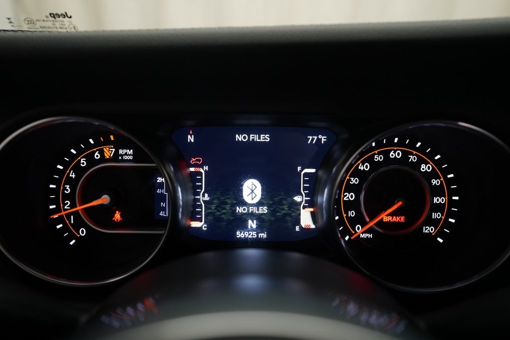 110 MPH Vehicle Max Speed Calibration, 3.45 Rear Axle Ratio, 4-Wheel Disc Brakes, 9 Speakers, ABS brakes, Air Conditioning, Alloy wheels, AM/FM Radio, Available Sirius XM Radio, Apple CarPlay/Android Auto, Auto-dimming Rear-View mirror, Automatic temperature control, Aux Battery, Black 3-Piece Hard Top, Blind Spot & Cross Path Detection, Brake assist, Cloth Low-Back Bucket Seats, Cold Weather Group, Compass, Corning Gorilla Glass, Delay-off headlights, Driver door bin, Driver vanity mirror, Dual front impact airbags, Dual front side impact airbags, Dual-Climate Control, Electronic Stability Control, Emergency communication system: SiriusXM Guardian, Engine Oil Cooler, Freedom Panel Storage Bag, Front anti-roll bar, Front Bucket Seats, Front Center Armrest w/Storage, Front fog lights, Front reading lights, Fully automatic headlights, Garage door transmitter, Heated Front Seats, Heated Sideview Mirrors, Heated Steering Wheel, Heavy Duty Suspension w/Gas Shocks, Illuminated entry, Integrated roll-over protection, Leather steering wheel, Low tire pressure warning, MOPAR Grab Handle Kit, Navigation System, No Soft Top, Non-Lock Fuel Cap w/o Discriminator, Occupant sensing airbag, Outside Temperature Display, Panic alarm, ParkSense Rear Park Assist System, ParkView Rear Back-Up Camera, Passenger door bin, Passenger vanity mirror, Power Door Mirrors, Power steering, Power windows, Quick Order Package 23G, Radio data system, Radio: Uconnect 4C Nav w/8.4" Display, Rear anti-roll bar, Rear reading lights, Rear Window Defroster, Rear Window Wiper/Washer, Remote keyless entry, Safety Group, Security system, Speed control, Split Folding Rear Seat, Steering wheel mounted audio controls, Stop-Start Dual Battery System, Tachometer, Telescoping steering wheel, Tilt steering wheel, Traction Control, Trip computer, Variably intermittent wipers, Voltmeter, Wheels: 18" x 7.5" Polished w/Gray Spokes.