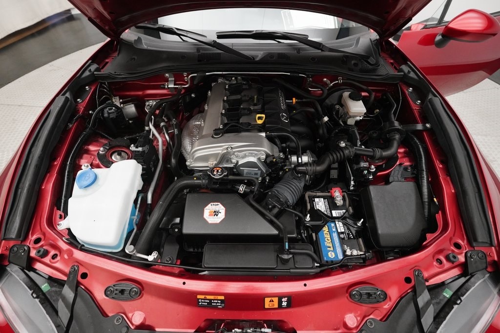 4-Wheel Disc Brakes, 9 Speakers, ABS brakes, Advanced Keyless Entry System, Air Conditioning, Alloy wheels, AM/FM Radio, Available Sirius XM Radio, Auto High-Beam Headlights, Auto-dimming door mirrors, Auto-dimming Rear-View mirror, Automatic temperature control, Brake assist, Bumpers: body-color, CD/MP3 Player, Convertible HardTop, Convertible roof lining, Convertible roof wind blocker, Delay-off headlights, Driver vanity mirror, Dual front impact airbags, Dual front side impact airbags, Electronic Stability Control, Emergency communication system: Mazda Connect, Four wheel independent suspension, Front anti-roll bar, Front Bucket Seats, Front Center Armrest, Fully automatic headlights, Garage door transmitter: HomeLink, Glass rear window, Heated Front Bucket Seats, Heated Front Seats, Heated Sideview Mirrors, Illuminated entry, Leather Shift Knob, Leather Upholstery, Low tire pressure warning, Navigation system: MAZDA CONNECT, Occupant sensing airbag, Outside Temperature Display, Panic alarm, Passenger vanity mirror, Power convertible roof, Power Door Mirrors, Power steering, Power windows, Radio data system, Radio: AM/FM/HD w/Navigation & CD Player, Rain Sensing Wipers, Rear anti-roll bar, Rear/Front Window Defroster, Remote keyless entry, Security system, Soul Red Metallic Paint Charge, Speed control, Speed-sensing steering, Sport steering wheel, Steering wheel mounted audio controls, Tachometer, Tilt steering wheel, Traction Control, Trip computer, Variably intermittent wipers, Wheels: 17" Dark Silver Alloy.